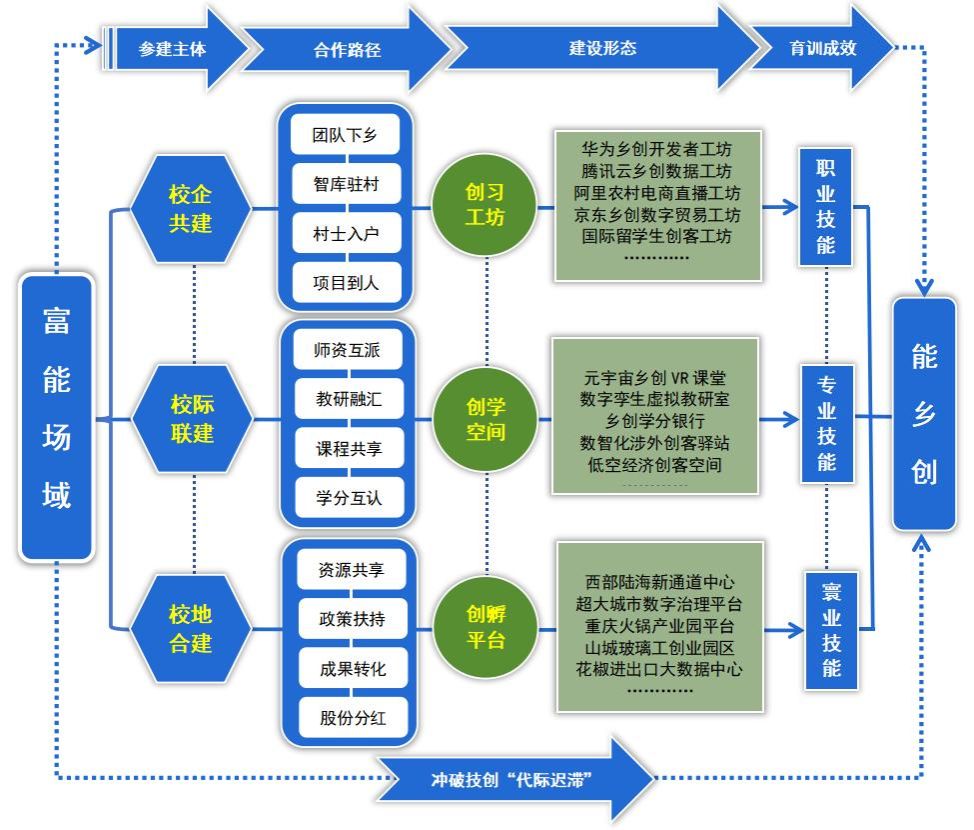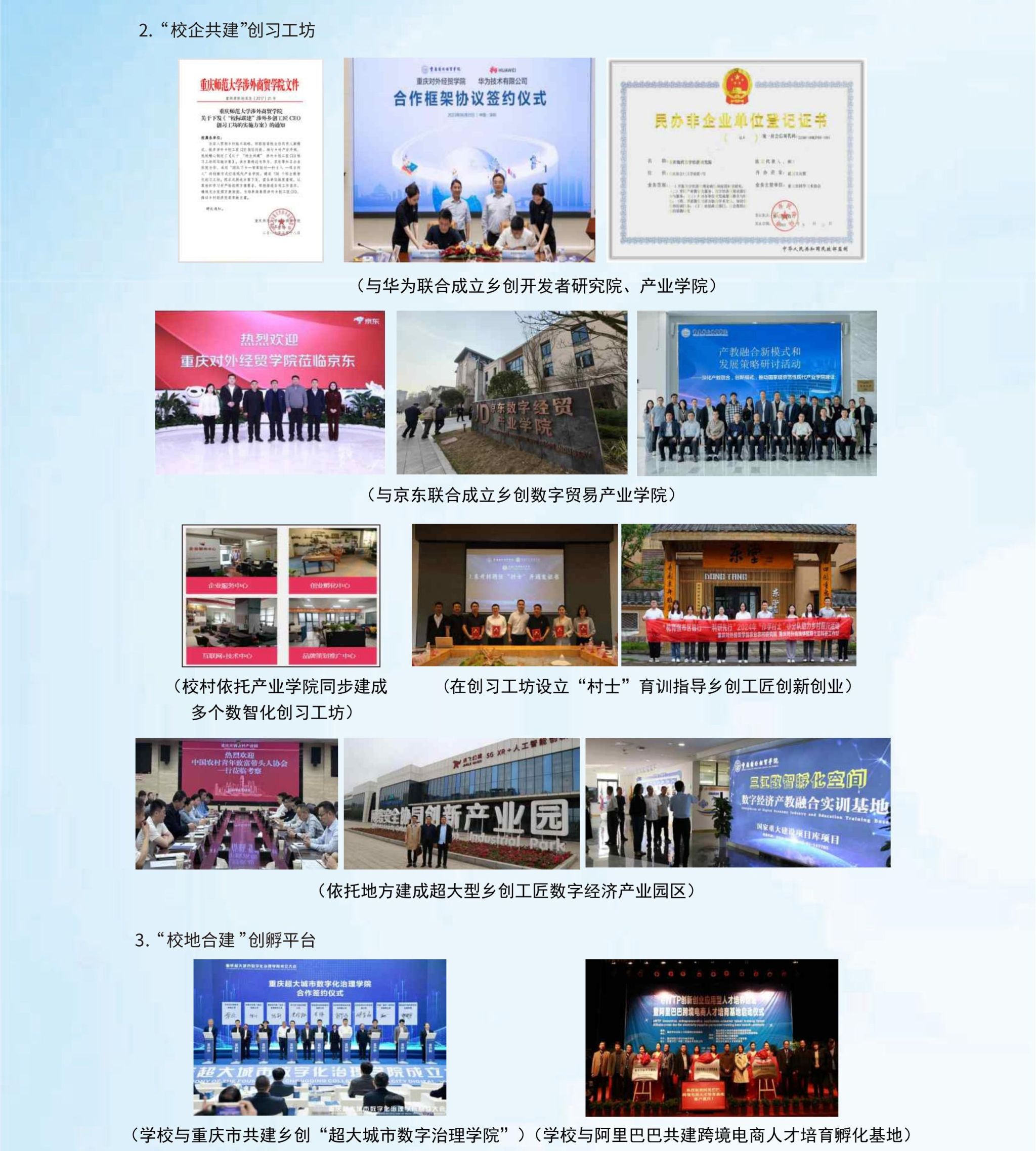 2“校企共建”创习工坊。构建“团队下乡—智库驻村—村士入户—项目到人”协同机制,携手华为、京东等头部涉外企业合股投入6000万打造现代示范性产业学院,建成136个数智化涉外创习工坊,首设10名“作孚村士”及涉外乡创文化传承人岗位,专职推进项目落地转化,为乡村振兴注入数智化动能,提升职业技能