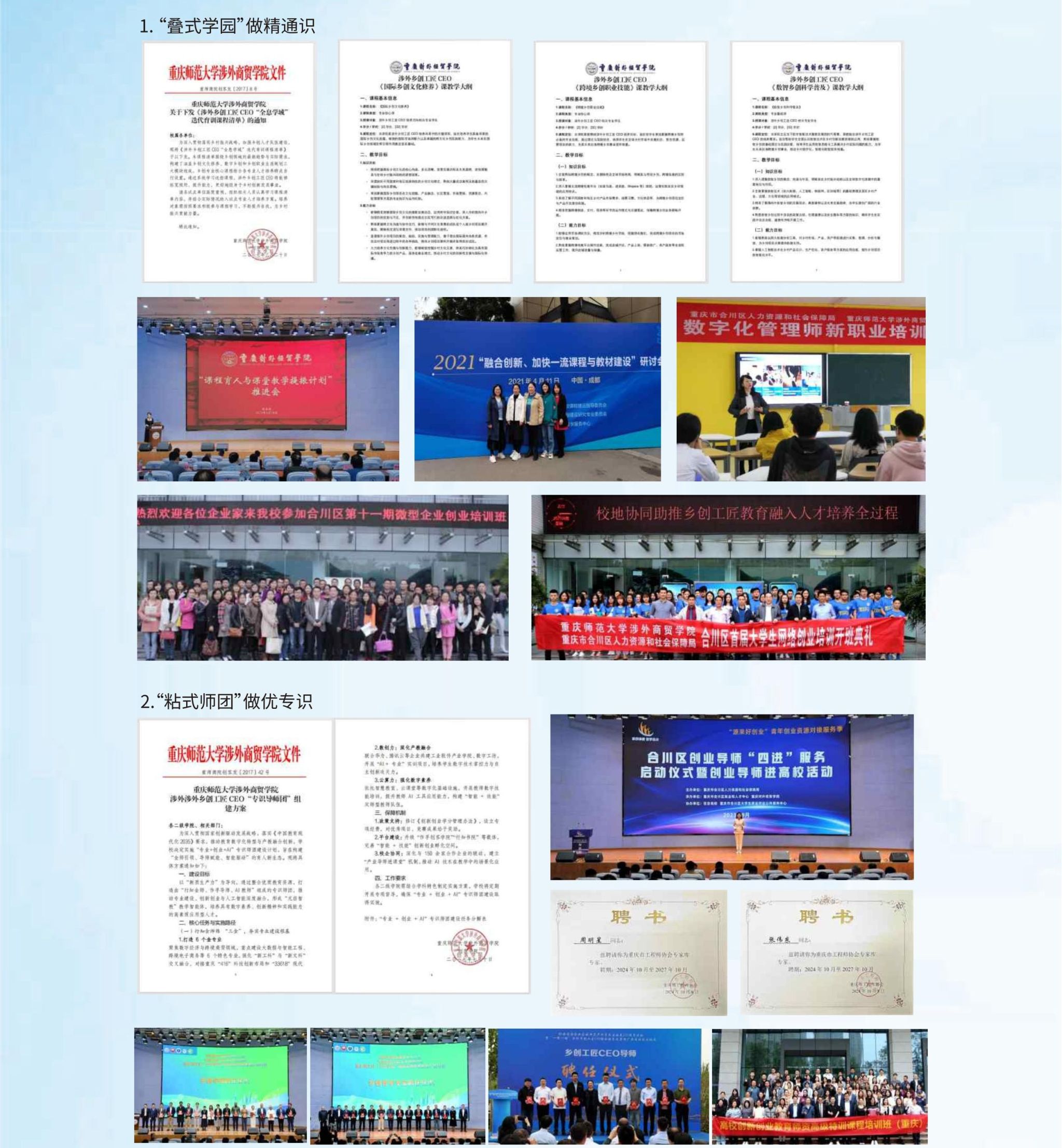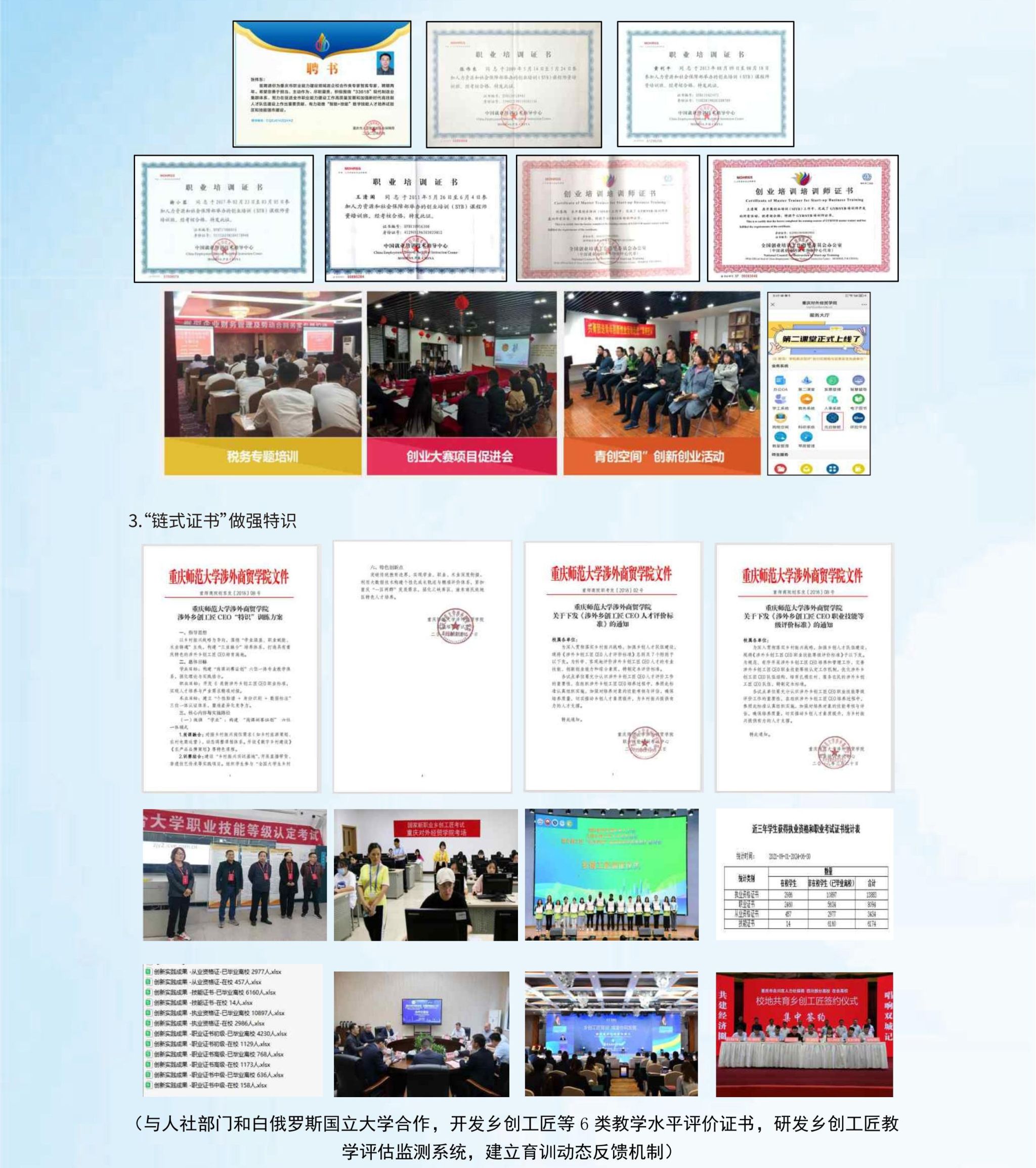 (3)“链式证书”做强特识。开发“学业+职业+术业”特识图谱。精进“学业”,创设“岗课训赛证创”一体化育训模式;增强“职业”,与人社部门等合作研发6类涉外乡创工匠CEO职业评价标准;做特“术业”,认定一批具有数字标注、国际通用的“涉外乡创工匠CEO证”。打造“学业奠基—职业赋能—术业增值”三级贯通特识标准。